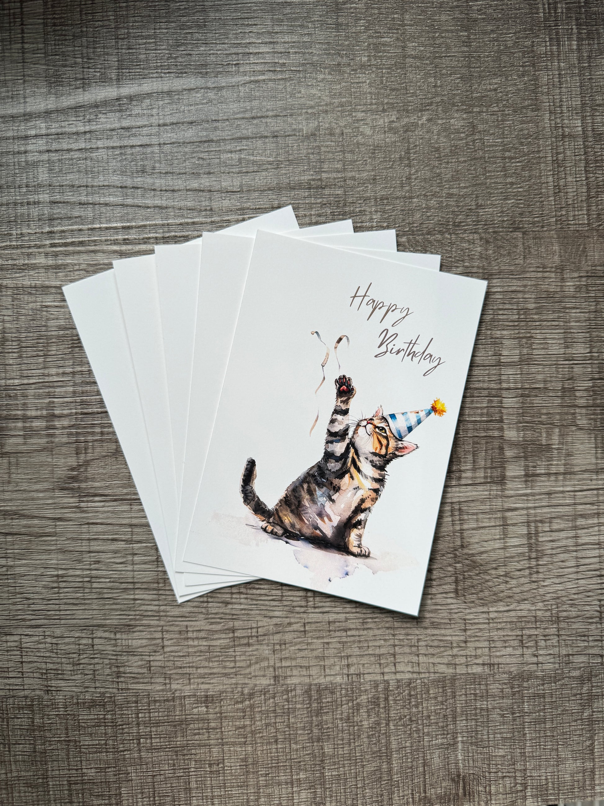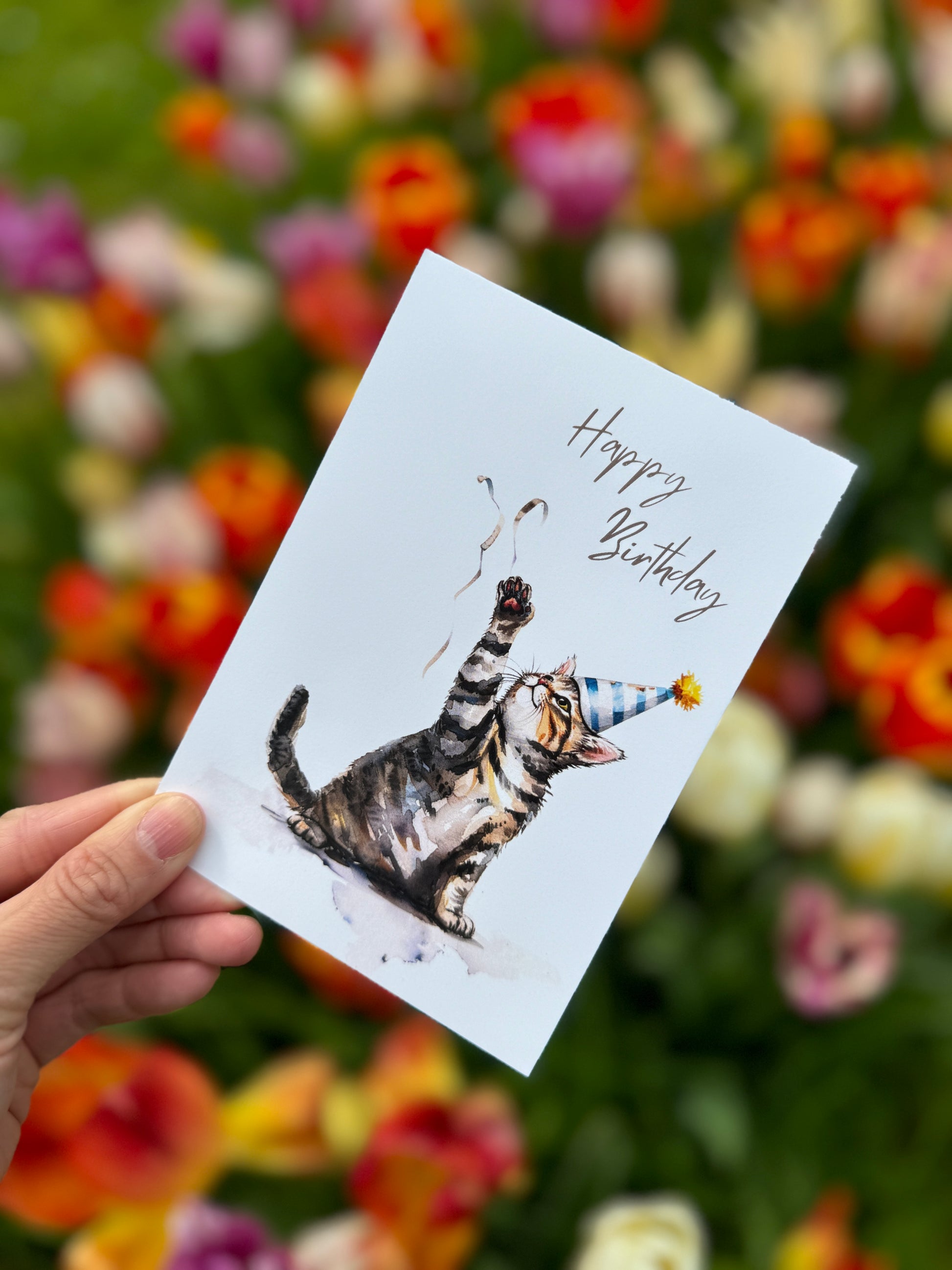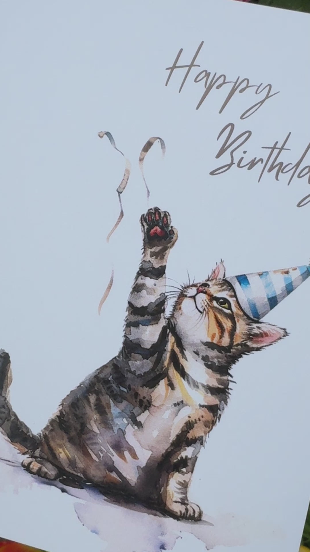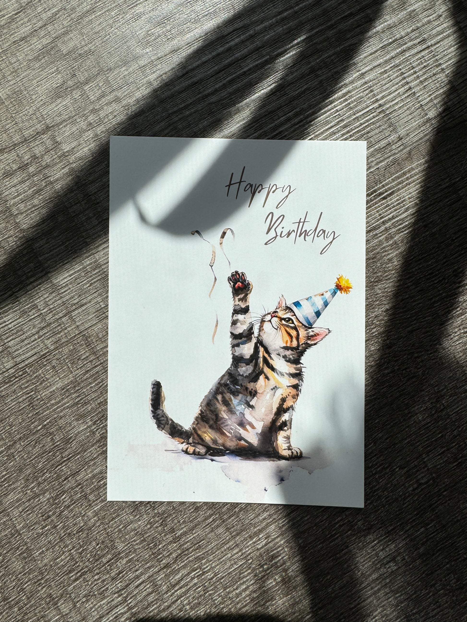 Überrasche mit einem charmanten 'Happy Birthday' von einer verspielten Katze im zauberhaften Aquarell-Stil! Individualisiere deine Grüße mit persönlichen Worten.